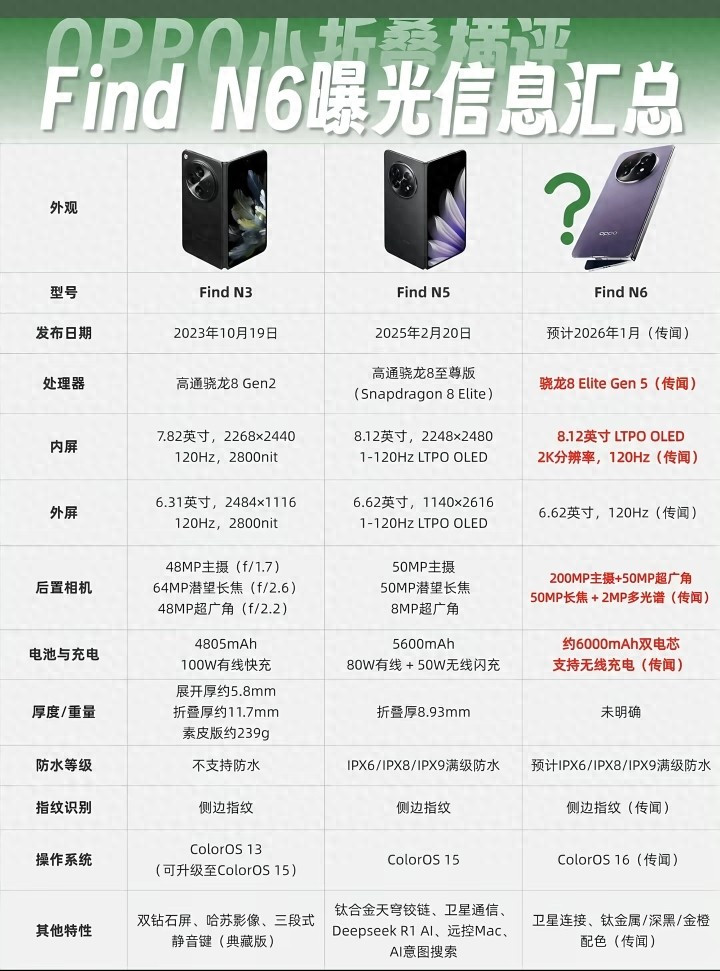 3:传闻中的Find N6预计将于2026年3月发布。它预计将搭载骁龙8 Elite Gen 5处理器,继续沿用高通的旗舰芯片。内屏尺寸预计为8.12英寸,采用LTPO OLED技术,分辨率为2K,支持120Hz刷新率。外屏尺寸预计为6.62英寸,支持120Hz刷新率。影像系统方面,Find N6预计将配备2亿像素主摄、5000万像素超广角镜头、5000万像素长焦镜头以及200万像素多光谱镜头。电池与充电方面,预计内置约6000mAh双电芯,支持无线充电。防水等级方面,预计将支持IPX6/IPX8/IPX9满级防水。指纹识别预计将采用侧边指纹。操作系统预计将升级为ColorOS 16。其他特性预计将包括卫星连接、钛金属材质以及深黑、金橙配色等。